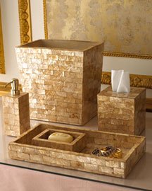 Gleaming golden vanity accessories are made from farm-raised kappa shells. Each piece is carefully cut, colored and shaped by hand to achieve an intricate pattern. A lacquer finish adds shine and makes the accessories easy to clean with just mild soap and water. Imported.